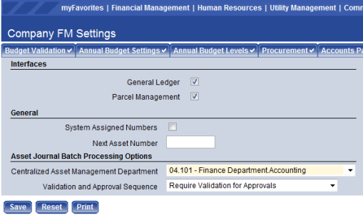 Maintenance > Financial Management > Company FM Settings>Asset Management tab