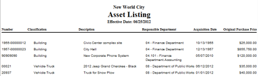 The Asset Listing is the most basic of the asset reports. It provides a list of assets based on many options to search from.