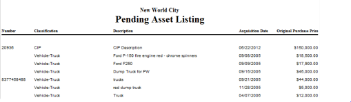 The Pending Asset Listing report is very similar to the Asset Listing; however, it only shows assets with a status of pending. A pending asset is an asset item that was initiated into the asset management module from a procurement or accounts payable entry.