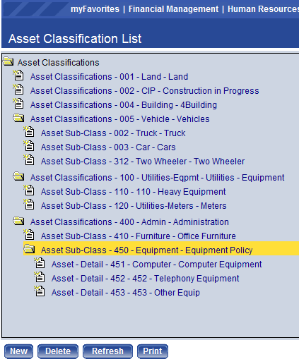 The Asset Classification page allows authorized users to add and maintain the asset classification codes. All assets will be assigned a classification via the procurement item used to create the asset. All procurement items will be assigned a classification and will have default information used for asset entry. Reports can be run based on these classifications.