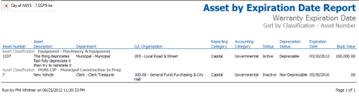 The Asset by Expiration Date report lists assets and their book values based on an insurance, lease, warranty or license expiration date.
