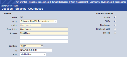 Maintenance>new world ERP Suite>Miscellaneous Definitions>Locations, Location setup screen