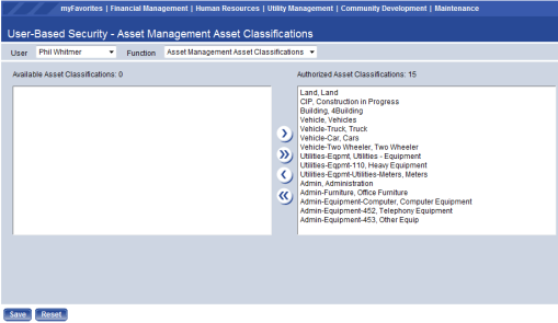 The Asset Management Asset Classifications function of User-Based Security is where users are assigned the Asset Classifications they can maintain and/or inquire on within the Asset Management module.