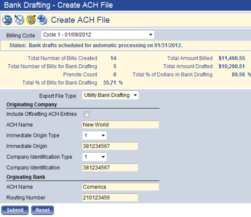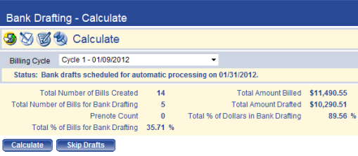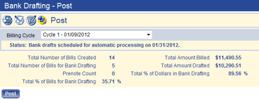 When cycle billing is processed, appropriate Bank Draft accounts will be included for processing; these accounts will appear in a batch format to be maintained and submitted to the bank.