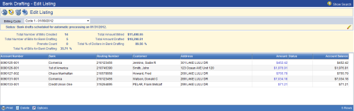The Edit Listing page will display a list of all accounts to be included in bank drafting.