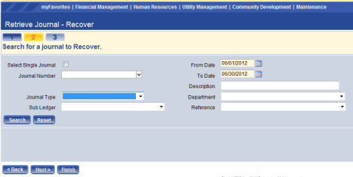To Date – This field is required when the Select Single Journal check box is cleared. This allows the user to search for a journal based on a date range.