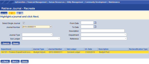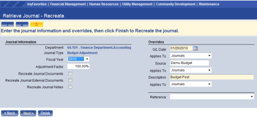 Once all of the information has been entered for the journal to be recreated, select the finish button at the bottom of the page.
