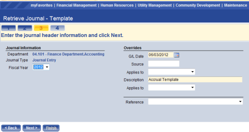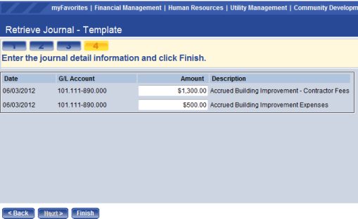 Once the template has been selected, click Next and the template journal detail page will display. Enter the amounts for each of the accounts specified in the template.