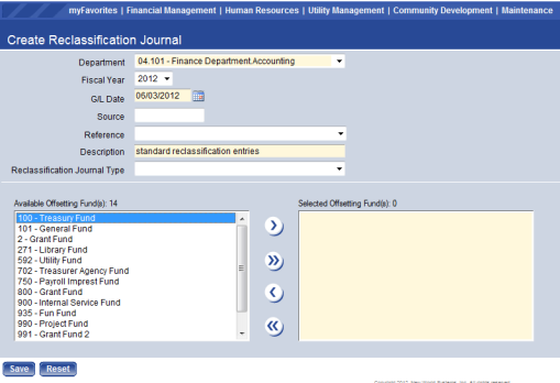 Note: Reclassification entries are only used for governmental reporting purposes. Specific General Ledger Expense/Revenue Accounts may be in the wrong classification for GASB reporting purposes. The system allows only one classification for the base account. The account may have a different classification depending on the organization set assigned. This reclassification would allow the user to automatically move the balances in this account to a different account that is coded with the proper GASB classifications at year end.