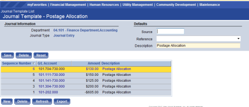 Once Save has been clicked, the page will reload with the bottom of the page available to start adding G/L accounts and sequences for the journal entry template. To begin entering new sequences, click New.