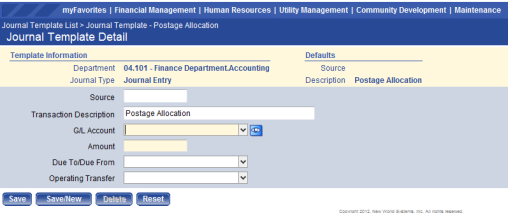 Completing this page will create one line item for each entry. If multiple entries need to be created, select the Save/New feature and the line item will be saved and a new blank screen will be listed allowing for another line item to be created. If there are no more entries to be entered, select the Save feature. Once the entry has been saved, breadcrumb back to the Journal Template List screen to view the completed template. Now the template is able to be used in the Template Journal screen.