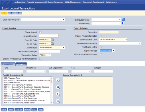 Load Saved Report – This field is where a user would load a saved report for use. Once selection criteria have been entered for journal entries, the system allows a user to save the search criteria for future use. This is a very helpful tool if the same entries are being exported frequently.