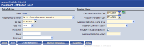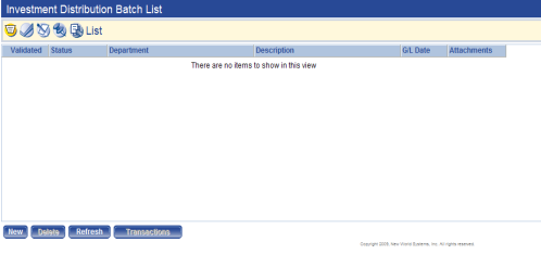 Click the New button at the bottom of the Investment Distribution Batch List page to create a new Investment Distribution Batch.