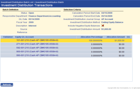 After making completing the selections on the Investment Distribution Batch page, click Create Transactions. On a prorated basis, the Investment Distribution Amount will be allocated to all of the accounts associated with the Investment Distribution Journal Group that was selected.