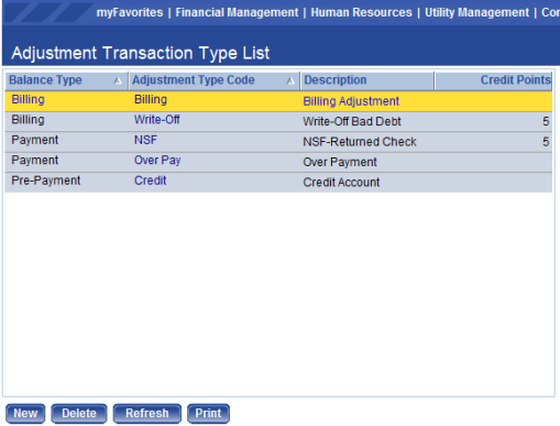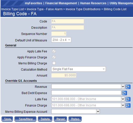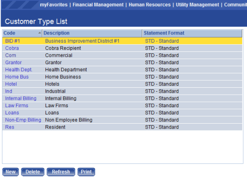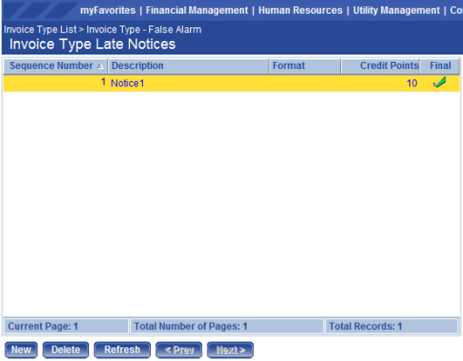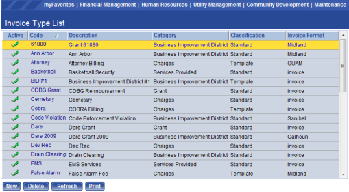 The Invoice Type List page allows authorized users to view a list of all existing invoice types. On this page a user can also add new invoice types and edit or delete existing types. Invoice Types are used for categorizing invoice formats, late notices, billing codes, and general ledger distributions. The software allows the system administrator to define the different types of invoices generated by your municipality and all the types of activities billed on the different invoice types.
