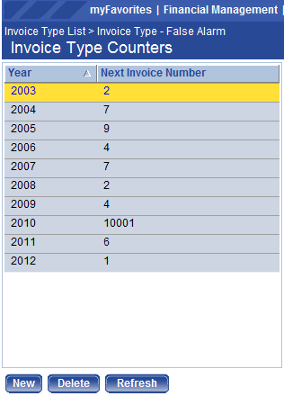 To delete an invoice type from the list, select it in the list and click Delete. The Delete button is hidden or disabled if the user does not have the appropriate security permissions. If authorized, when Delete is clicked the user is prompted to confirm the deletion.
