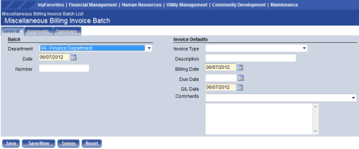 - In Department, select the department responsible for the batch. The list is populated with all departments to which you are authorized. If there is a Centralized Miscellaneous Billing Department on the Miscellaneous Billing tab on the Company FM Settings page, and you have process authority within this department, the list defaults with this department value.