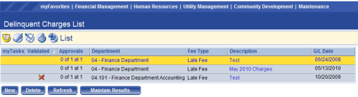 To delete a delinquent charge batch click Delete. The Delete button is hidden or disabled if you do not have the appropriate security permissions. If you are authorized, when you click Delete you are prompted to confirm the deletion.