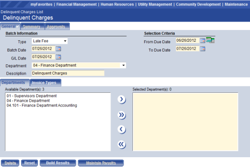 - Use From Due Date to select all qualifying invoices with a due date greater than or equal to the To Due Date that will be assigned late charges or finance fees. It must be less than or equal to the To Due Date. The default is the current system date.