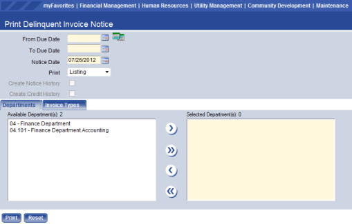 - Click Print to print Delinquent Invoice Notice, the Delinquent Notice Invoice Listing, or both. It prints based on the value selected within the Print drop-down list. It also sends the Invoice Late Notice Listing to myReports.