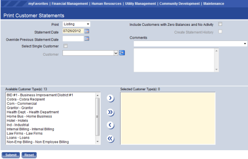 - Click Submit to print the customer listing and/or statement and send it to myReports.