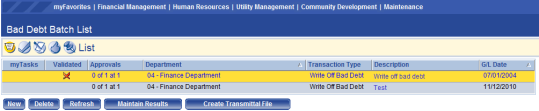 To delete a bad debt batch click Delete. The Delete button is hidden or disabled if the user does not have the appropriate security permissions. If authorized, when the user clicks Delete they are prompted to confirm the deletion.