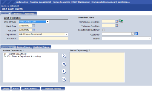 - Click Build Results, which selects the invoices for bad debt processing and creates the corresponding transactions. This button is hidden if you do not have Add rights to the Miscellaneous Billing - Bad Debt Batch Processing security component.