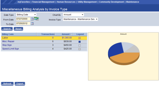 Chart By – Choose from Amount or Transaction. Amount will display the dollar amounts that have been entered for each Billing Code within an Invoice Type and Transaction will show the number of transactions entered for Billing Codes within an Invoice Type.