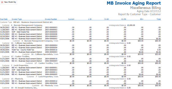 The Miscellaneous Billing Invoice Aging Report displays the amount of Open Invoices per Customer and how far past due they are. This report is also a very commonly run report for Miscellaneous Billing.