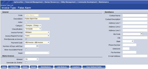 The Invoice Type page allows authorized users to enter and maintain the invoice types used by your municipality that are sent to customers. It may be accessed for a given record by clicking on the Code column hyperlink. Invoice Types are used for categorizing invoice formats, late notices, billing codes, and general ledger distributions. The software allows the system administrator to define the different types of invoices that are generated by your municipality and all the different types of activities that are billed on the different invoice types.