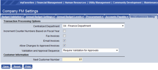 Validation and Approval Sequence – This drop-down decides the order in which a user must proceed through the work flow buttons as transactions are entered in the Miscellaneous Billing module.