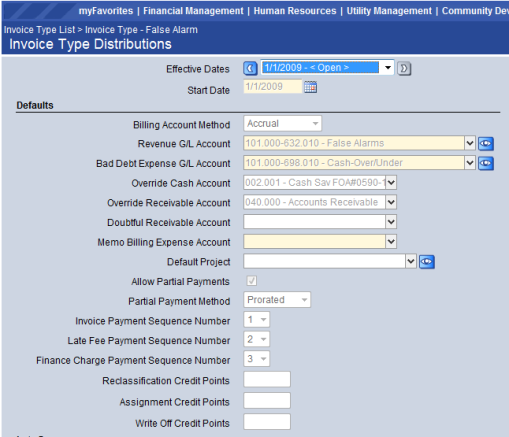 Doubtful Receivable Account – If Accrual is selected as a Billing Account Method, select a Doubtful Receivable Account, which is the receivable account to use when the receivable is reclassified to doubtful. If the attribute is not defined, invoices of this type cannot be selected in Bad Debt Processing for reclassification. It overrides the Fund's default A/R account setup. Use this if you have a specific account used to track doubtful A/R.