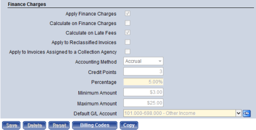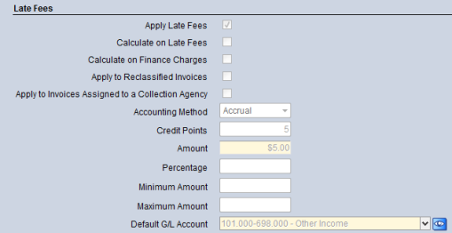 The Late Fees section groups the default late fee information for the invoice type. Users can assign the accounting method to use, dollar amount or percent within parameters, and a default GL account. The fields in this section are only visible when the Apply Late Fees check box is selected.