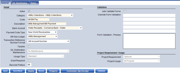 - For Utility Management Payment Codes choose the Payment Code Type of New World Receivables.