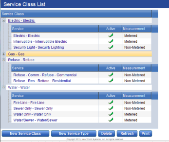 The next step in Utility Management setup is the definition of licensed services that will be connected to accounts. Similar to the way users setup Charge Categories with a summary level falling under parent categories, Service Classes work nearly the same way. First users create Service Classes and then they associate individual Service Types that will fall under those classes. For example an organization might have a Water Service, but beneath it there could be Water/Sewer, Water Only, or perhaps Fire Line.