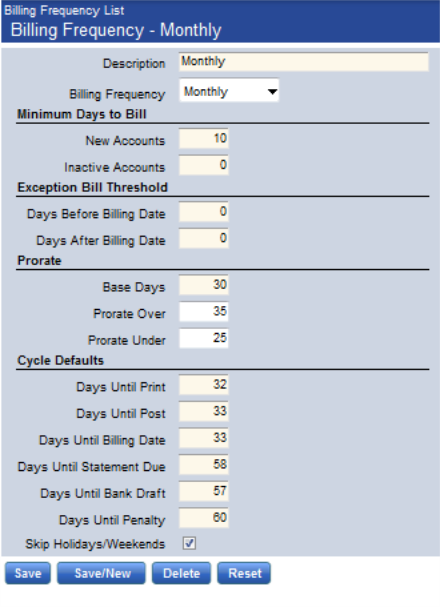The first step in creating a billing calendar is to define the frequencies from which dates will get created. These frequencies will represent how new accounts can be billed, exception bills can be sent, and how prorated is based. Also define the default amounts of days (from day one in a billing cycle) that certain events are to happen.