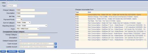 In the above example a Water Charge has been defined. This Water Charge falls under the Parent Level of Water. Notice the Charges Accumulate From grid. This represents all the Summary Level Charge Categories that fall under the Water Parent Level Charge Category.
