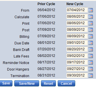 Use the New Billing Cycle if individual cycles are going to manually created. Clicking the New Billing Cycle button will open up a page where manual definition of dates for the individual events within a cycle can be done.