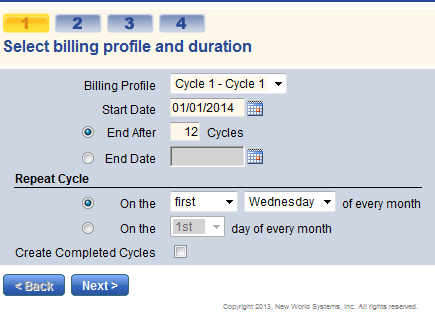 The first step in the New Cycle Wizard is to define Billing Profiles and Durations.
