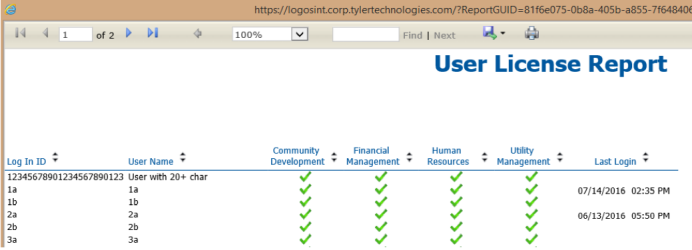 When the report runs, you will see output like the following. Users with check boxes have a license for that module. The users’ last logins also are shown, with sorting for each of the columns: