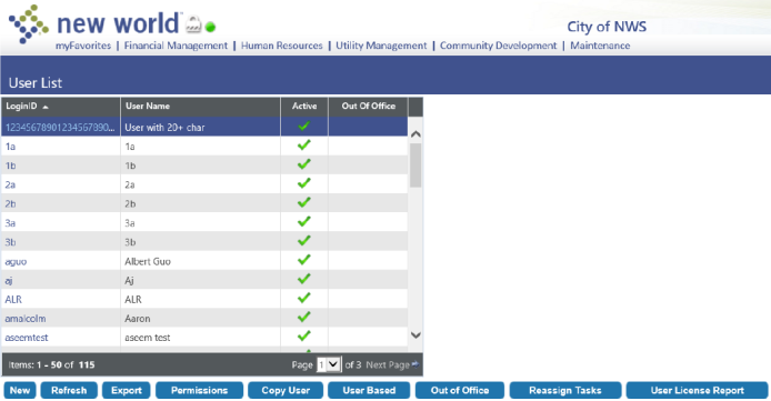 New World ERP works on a user license basis. Customers purchase a certain number of users per module in their license key. In New World ERP, each user login is associated with one or more modules. A new report was built into version 9.3SP1 of the New World ERP software to determine how many users are licensed per module.