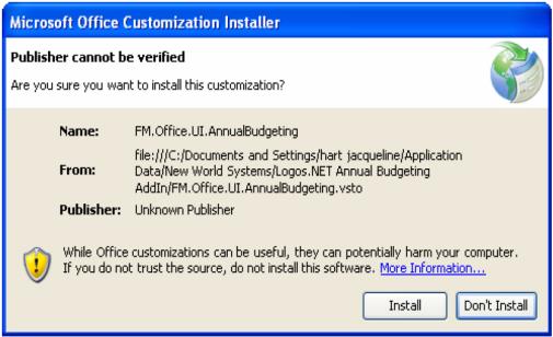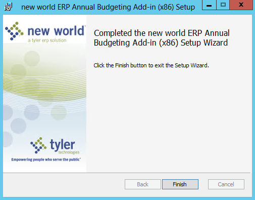 The New World ERP Annual Budgeting Add-In must be installed on every machine on which Excel will be used to retrieve and update budget information from New World ERP.