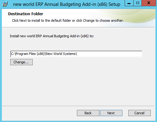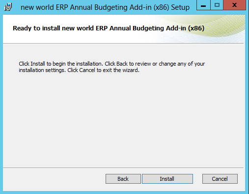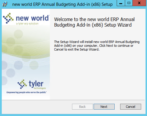 Run the FmBudgetExcelAddIn_<Office version>.msi to install the New World ERP Annual Budgeting Add-In Setup Wizard. The following pop-up window will open.