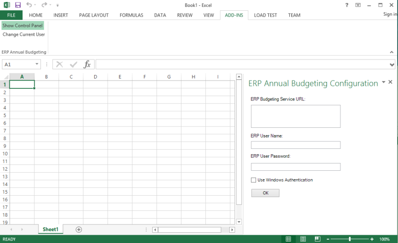 In the Add-Ins panel, click Show Control Panel to display the New World ERP Annual Budgeting Configuration panel on the right side of the window.