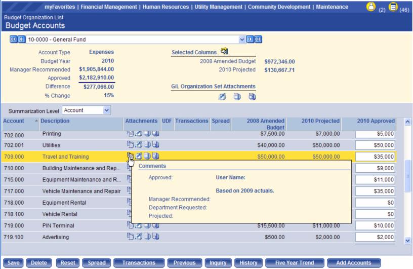 When you open the Budget Accounts page in New World ERP, the Comments icon