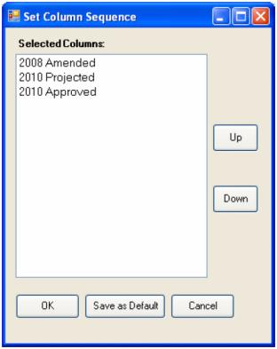 To change the order of the columns, click Load Set Order in the New World ERP Annual Budgeting panel. The Set Column Sequence pop-up window will open.