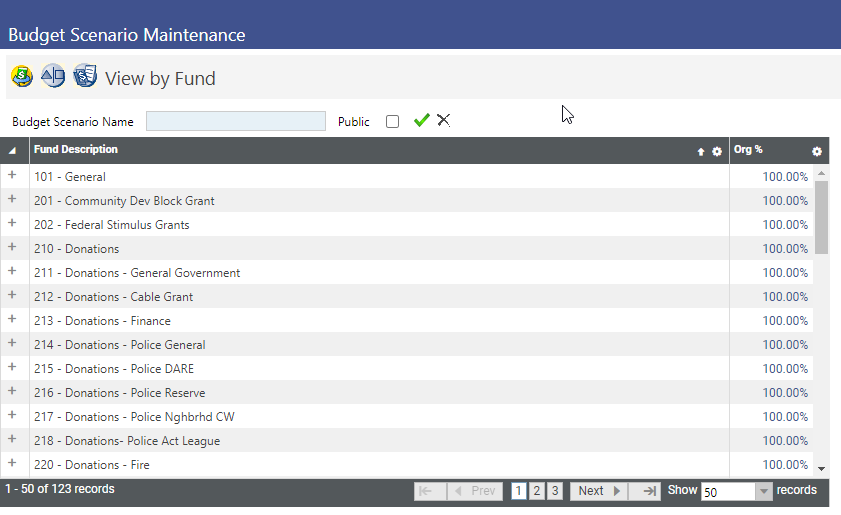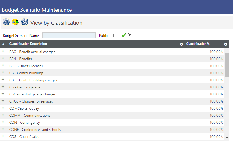 | Public | Signifies whether the budget scenario maintenance is a private or public scenario. If the check box is selected, all users can either maintain