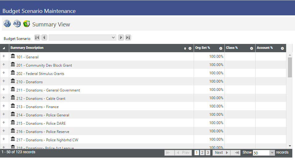 - Click the Percentage (for example, 100%) hyperlink on the Budget Scenario Maintenance page.