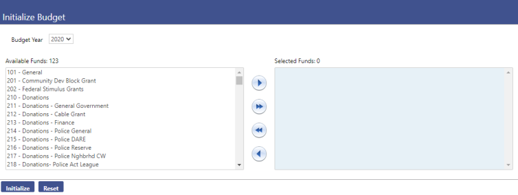 - In the Available Funds list, select all organization 1 elements to include in the budget initialization process and move the fund to the Selected Funds list. At least one fund must be selected.