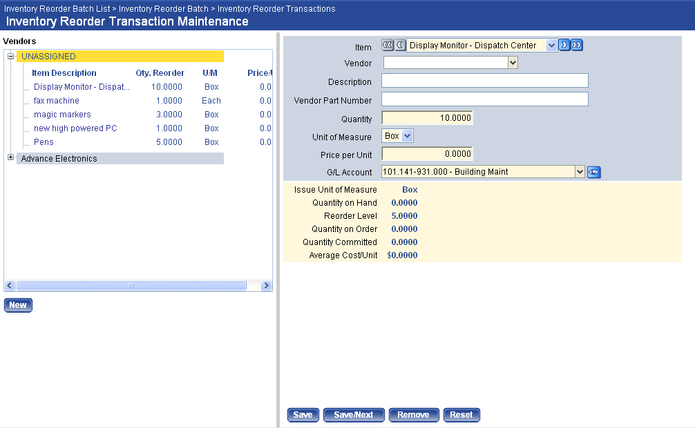 On the right-hand side of the page, make changes as needed to the item. The Save button stores the changes made to this item and stays on this page. If there are more items in the list to update, click Save/Next, which will store the changes to the current item and load the page populated with details for the next item in the list. To skip an item or go back to an item, use the DVD controls on the Item control. Specific items to be reordered can also be selected from the Item drop-down or by clicking on the Item Description from the left-hand side of the page.